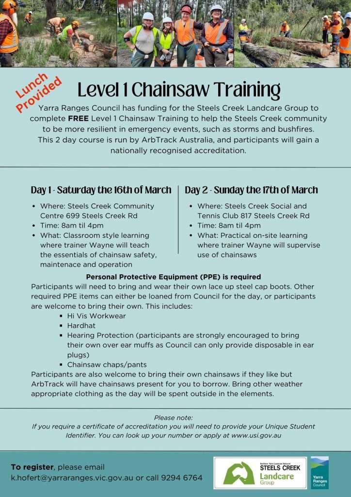 Yarra Ranges has funding for the Steels Creek Landcare group to complete an accredited Level 1 chainsaw training, free.